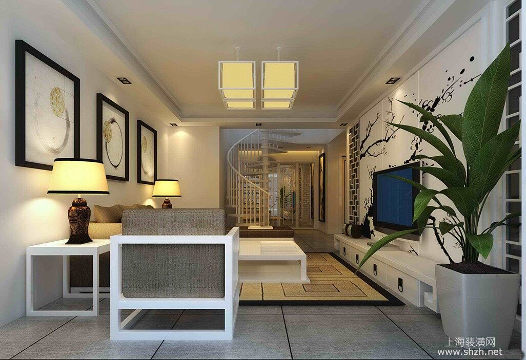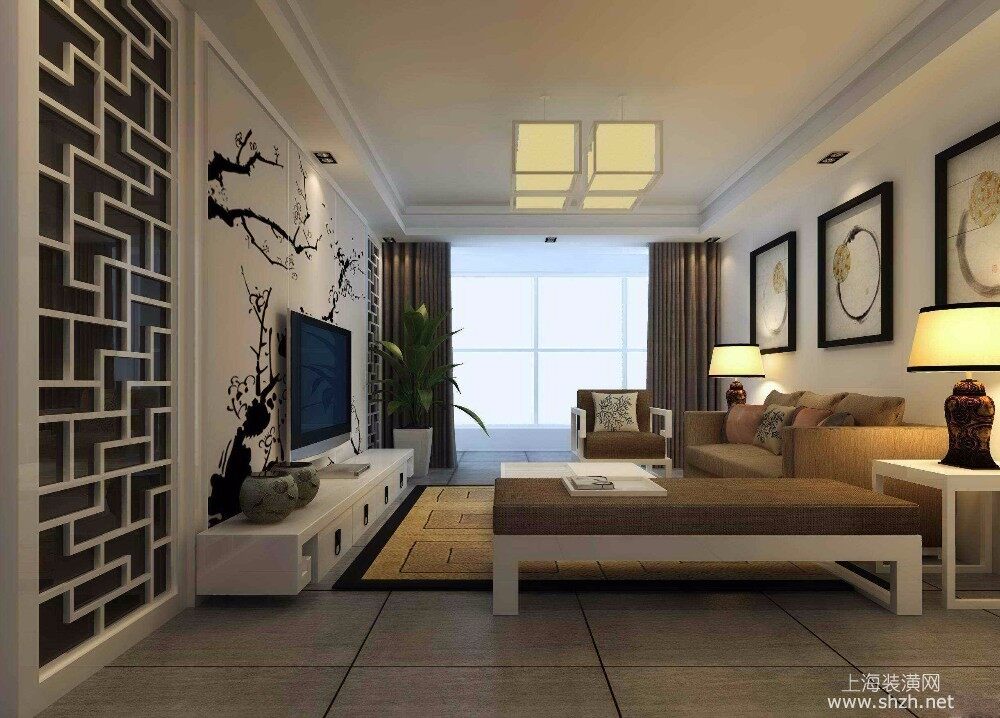 客厅 - 本案例风格为新中式风格,户型为三室两厅一厨一卫。