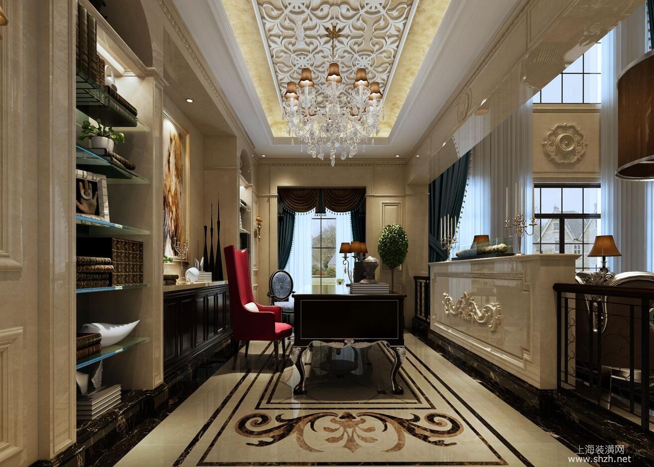 书房 - 饰品:艺术油画、布艺、雕塑、高幔、欧式窗帘和具有一定含义的欧式古典物品。