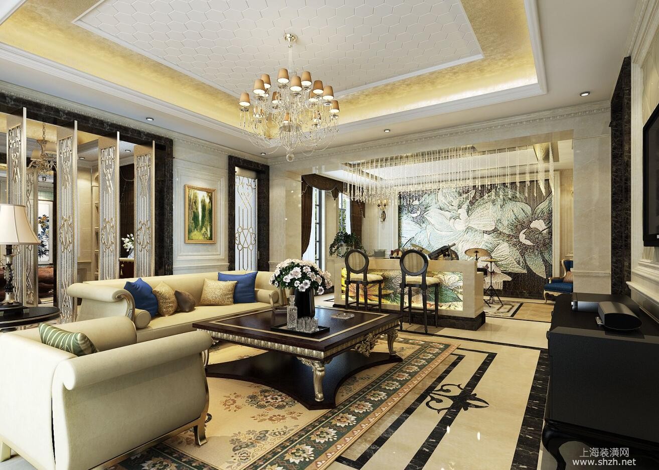 客厅 - 造型上采用以现代材料如大理石来做艺术裙墙配合马赛克的艺术剪画,和石材雕花。顶面运用香槟银的新材料做装饰顶。整体明亮、不失气派典雅的特点。
