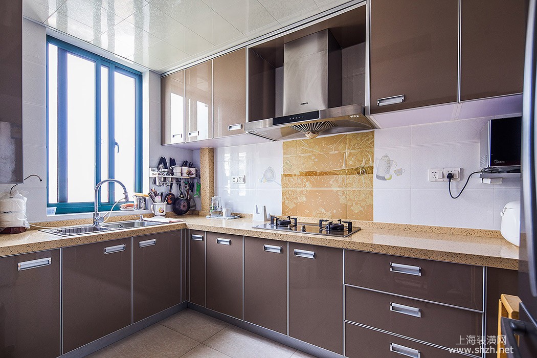 两室两厅中式风格厨房.jpg - 厨房是家庭生活中必不可少的因素,咖啡色晶钢面板,低调不奢华