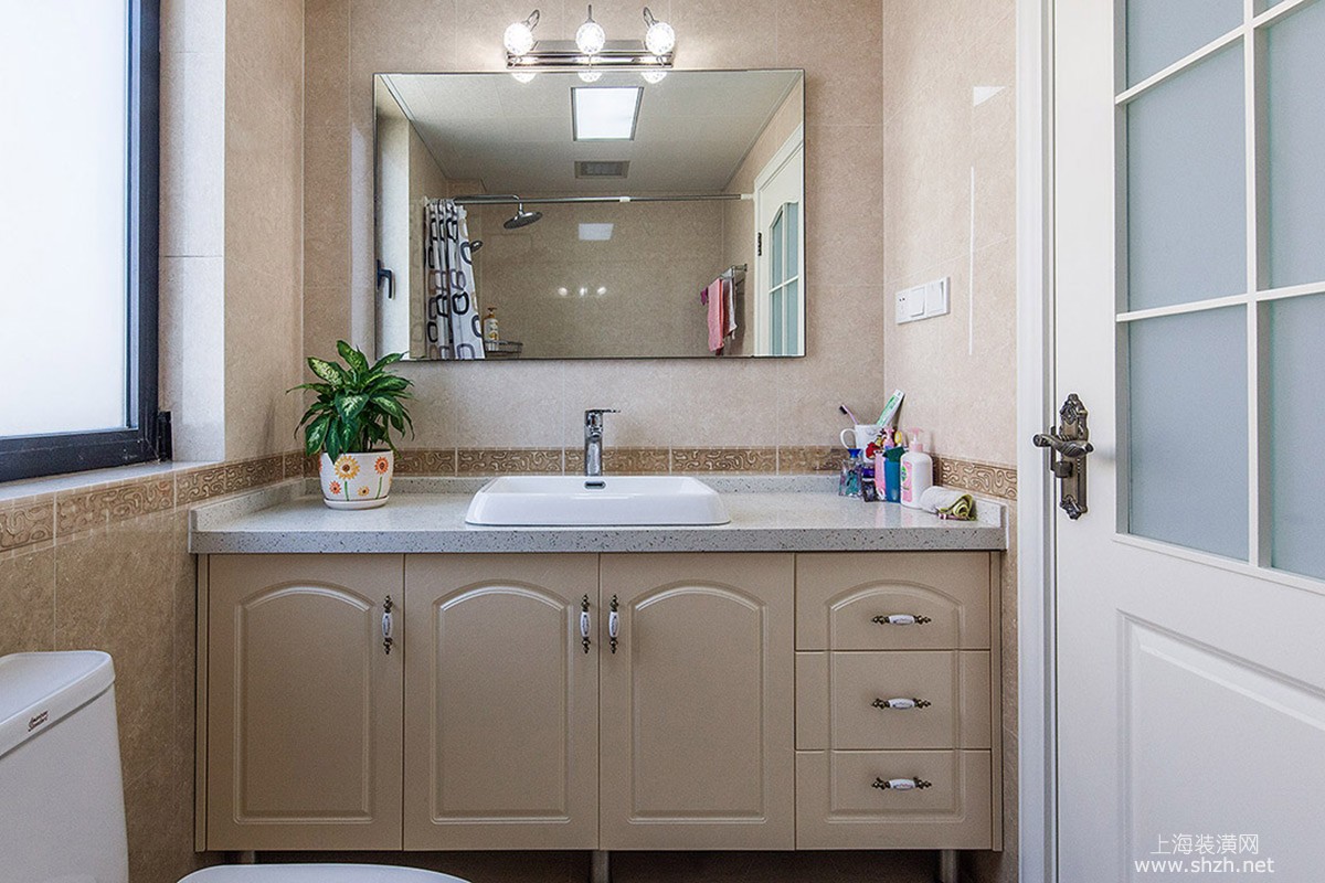两室两厅简欧风格浴室.jpg - 适度的改动让卫生间更加合理,原本狭小的台盆的空间布置利用的淋漓精致,让整个区域有了生机。