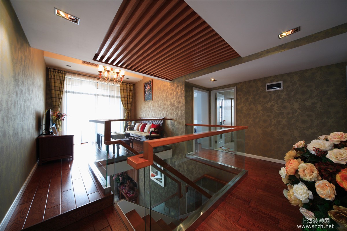 别墅现代简约楼梯.jpg - 二楼的楼梯采用了钢化玻璃和木结构,摒弃了传统的实木结构,既时尚又大气,配合着顶面的木饰面吊顶,相得益彰。