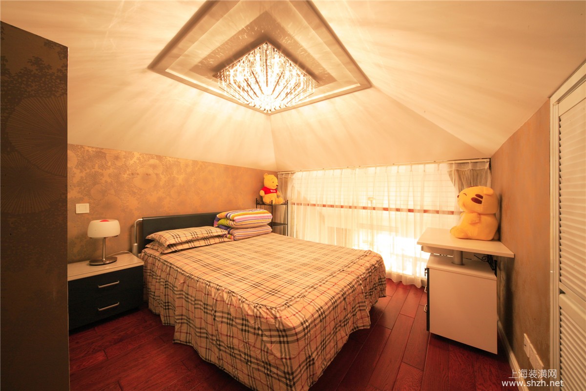 别墅现代简约卧室.jpg - 阁楼的面积被用在了客房区域,原本倾斜的顶面被设计成了阶梯形状,既美观又不压抑,客房的软装也只也没丝毫的”偷懒”,精致的摆设完全体现出业主的细心。