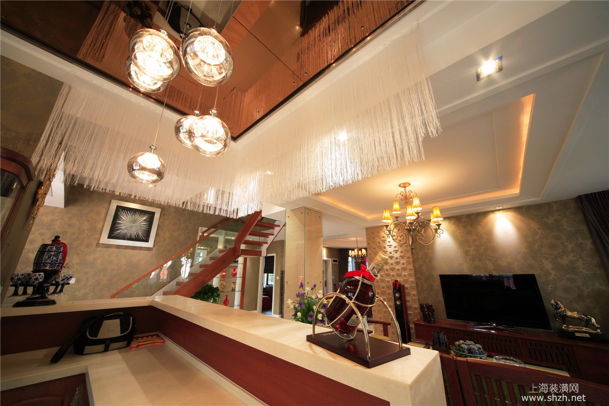 别墅现代简约客厅.jpg - 客厅整体风格采用木,镜,沙风格,是当下比较时尚也是板式的处理方式,在颜色上做了统一,配上精致的玻璃灯和线帘的装饰,把板式的硬线条做了软性富有稳重。