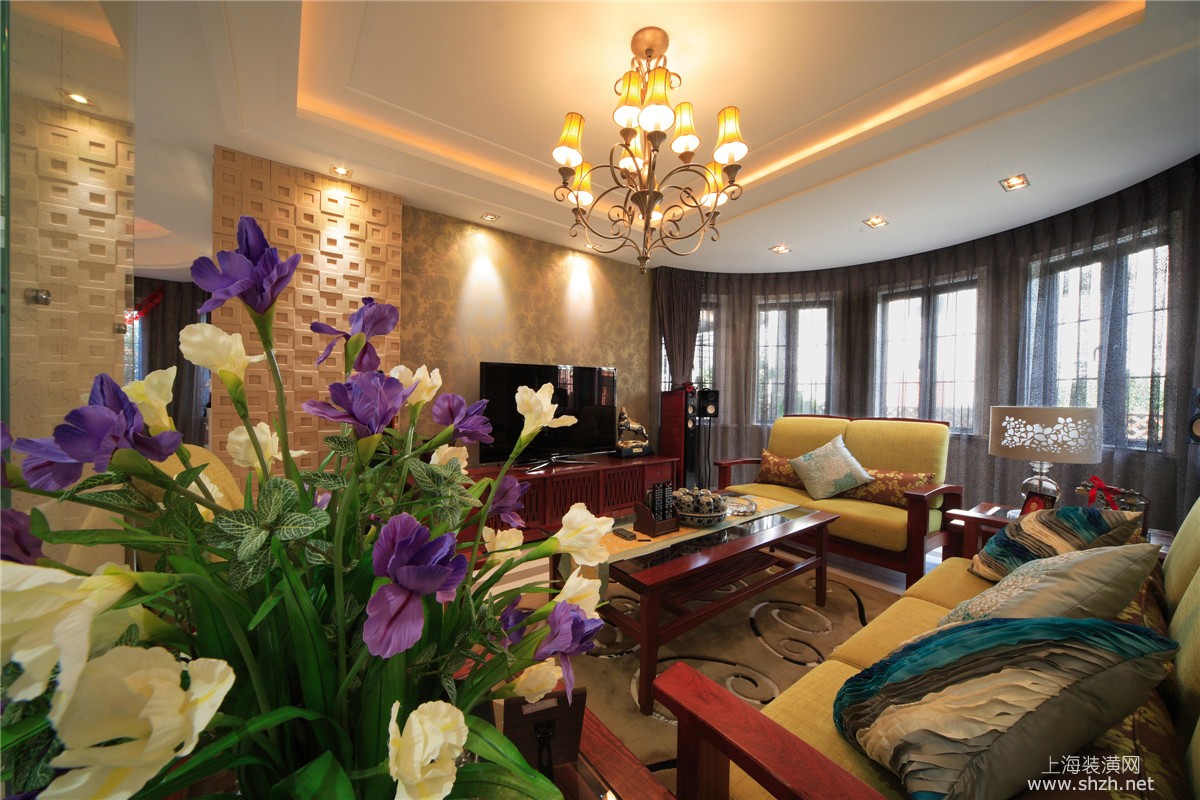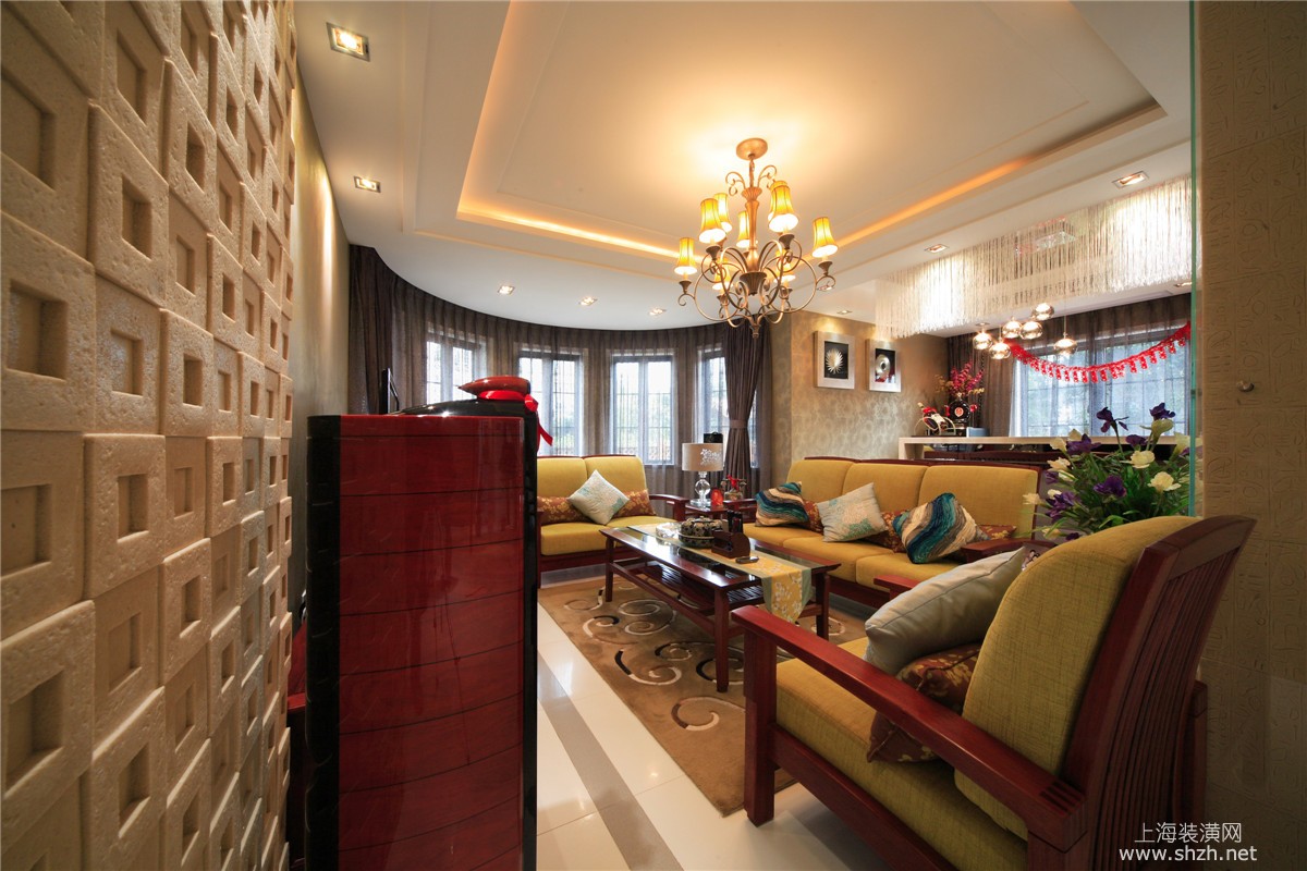 别墅现代简约客厅1.jpg - 客厅的沙发也是新中式的板式家具,不过上面的靠垫做了靓丽的黄绿色,和中式风格起到了混搭的作用。