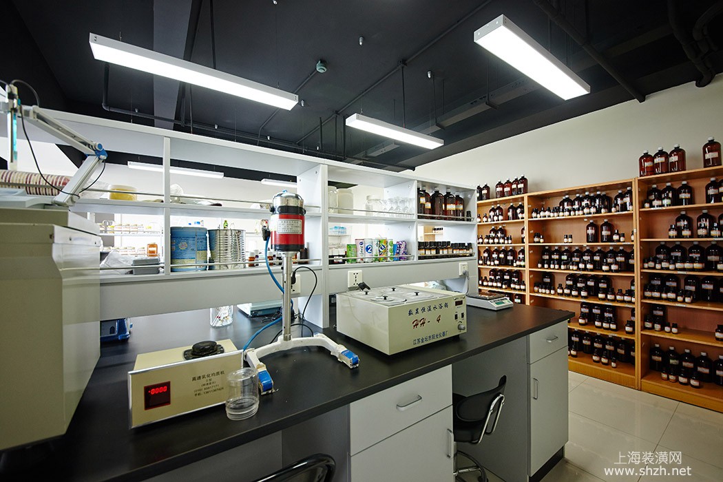 办公楼现代简约装修实验室.jpg - 实验室的样品柜实验台相邻,提供工作的便捷性,顶面的照明是简洁实用的日光灯,满足了照明亮度的要求
