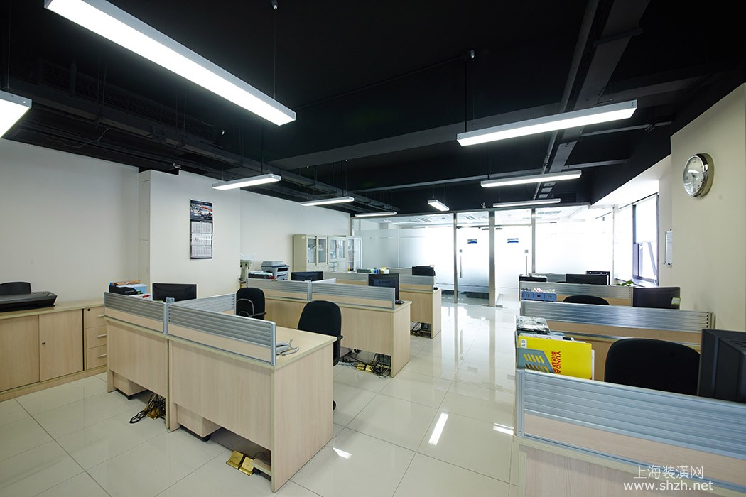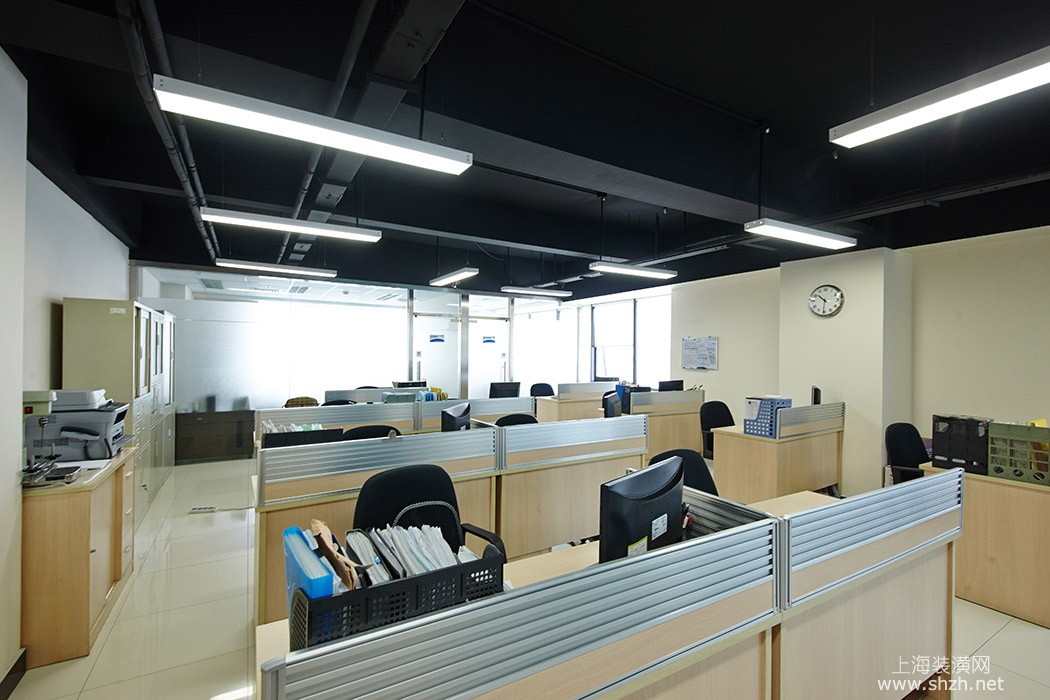 办公楼现代简约装修办公区3.jpg - 在办公区域的后面是总经理和副中办公室,方便了工作中领导与员工的沟通,顶部采用了黑色防火涂料,既遮掩了顶面管道的凌乱也体现了长形日光灯的效果。
