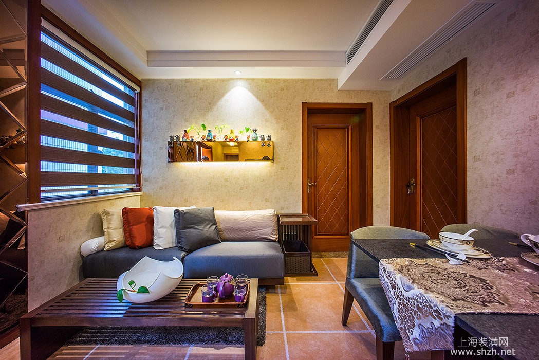小户型混搭风格装修客餐厅.jpg - 通过充分沟通,把本案设计定位为美式风格。实木家居的选配,墙纸、软装的色彩图案