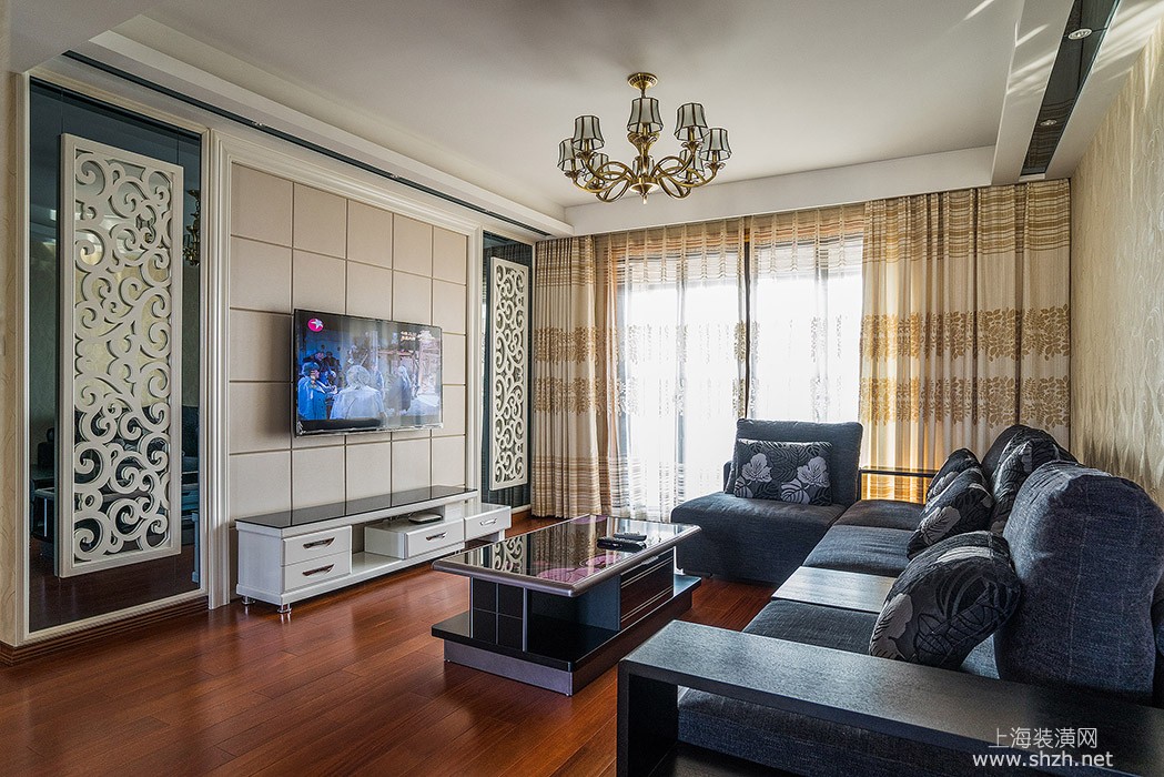 三室两厅混搭风格客厅.jpg - 电视背景采用了灰镜、雕花板、硬包等材质,简洁大气的现代造型增添了充满细节的传世的奢华,也与吊顶得到呼应。