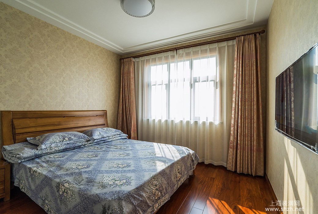 三室两厅混搭风格卧室.jpg - 木色在这里是居室主体色调,再配上米黄色墙纸,尽显整体居室的温馨舒适感。