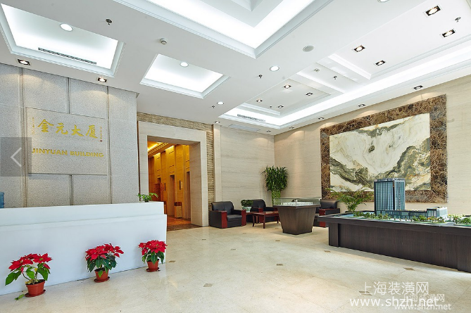 嘉定金元大厦办公室装修大厅.png - 浅色石材及不锈钢条的运用,显示出金属的质感和工业文明的主题;然而休息区的陈设却明丽葱郁,充满人文情感的自然气息,恰恰弥补了视觉中的刚硬个冷竣,使人倍感亲切;