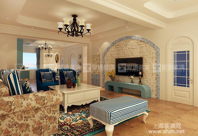 1.jpg - 三湘海尚285㎡地中海装修设计的客厅中,仿岩石质感的灰色砖墙,花纹纷繁华贵的沙发,造型感极强的橱柜,都为整个空间带来了一丝来自于海边的贴近自然的随性气氛。主卧室延续了客厅的风格,选用深蓝色的家居配色,加上经典的复古床品,演绎出浓浓的地中海浪漫风情。