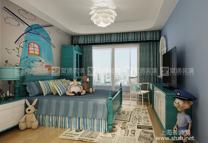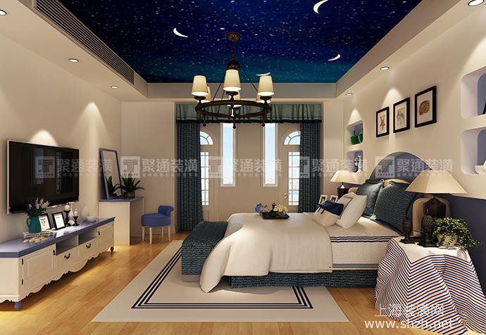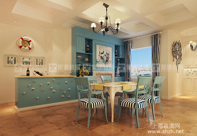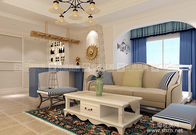 2.jpg - 三湘海尚285㎡地中海装修设计的客厅中,仿岩石质感的灰色砖墙,花纹纷繁华贵的沙发,造型感极强的橱柜,都为整个空间带来了一丝来自于海边的贴近自然的随性气氛。主卧室延续了客厅的风格,选用深蓝色的家居配色,加上经典的复古床品,演绎出浓浓的地中海浪漫风情。