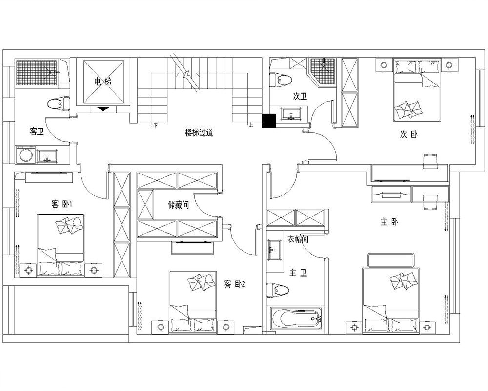 四楼卧室.jpg - 低调、不张扬、明快、简洁是业主的的要求,同时又要透出主人的文化底蕴及品味。室内日光充足,通透开敞,设计师采用大自然的石材作为地下室两层及一楼的主要材质,整体色调以低调的经典色黑白灰搭配,无论是色泽或是纹理,浑然天成,展现出大气恢宏的高品位质感。本案非常注重居室空间的布局与使用功能的完美结合,重视个性和创造性的表