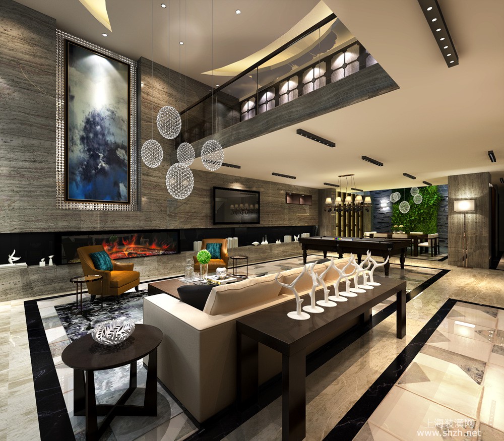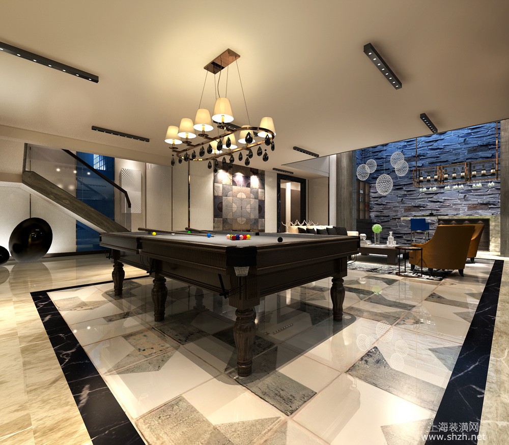 台球区.jpg - 低调、不张扬、明快、简洁是业主的的要求,同时又要透出主人的文化底蕴及品味。室内日光充足,通透开敞,设计师采用大自然的石材作为地下室两层及一楼的主要材质,整体色调以低调的经典色黑白灰搭配,无论是色泽或是纹理,浑然天成,展现出大气恢宏的高品位质感。本案非常注重居室空间的布局与使用功能的完美结合,重视个性和创造性的表