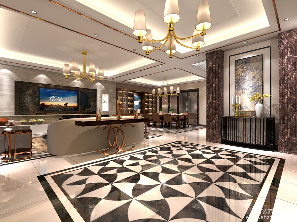 门厅及会客厅.jpg - 低调、不张扬、明快、简洁是业主的的要求,同时又要透出主人的文化底蕴及品味。室内日光充足,通透开敞,设计师采用大自然的石材作为地下室两层及一楼的主要材质,整体色调以低调的经典色黑白灰搭配,无论是色泽或是纹理,浑然天成,展现出大气恢宏的高品位质感。本案非常注重居室空间的布局与使用功能的完美结合,重视个性和创造性的表