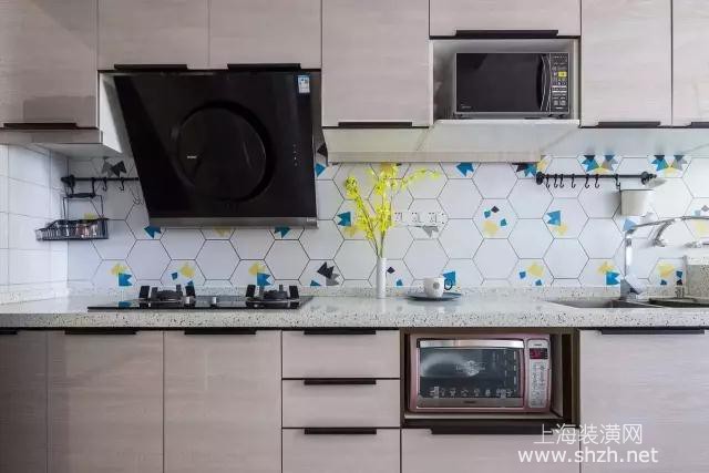 厨房 - 厨房墙面明亮的色彩十分炫目,不知道清洁会不会很麻烦,淡灰色的上下层橱柜保证了厨房的收纳,多功能的厨具使用也很方便实用。