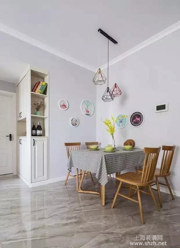 餐厅 - 餐厅设置在玄关的拐角处,不会占用客厅过多空间,工业风的吊灯搭配墙上的圆盘装饰画,显得十分有趣。