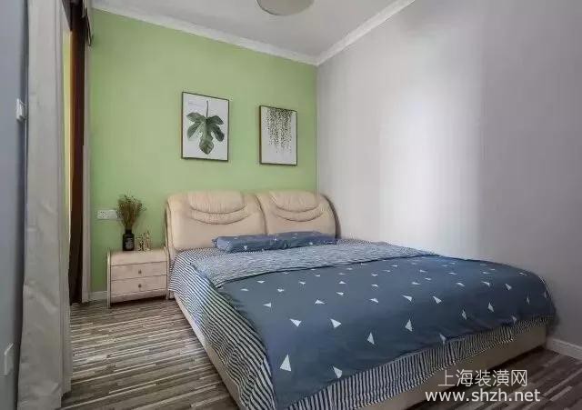 主卧 - 主卧是深浅的灰调木地板,嫩绿的背景,自然的绿植挂画,展示了生活的自然状态,静谧的环境十分适合夜晚的休息。