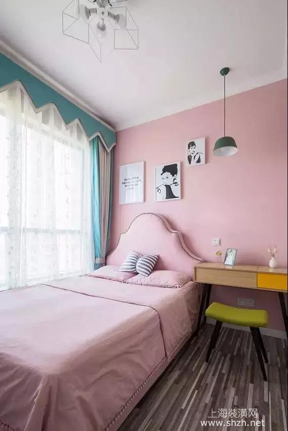 次卧 - 次卧则采用了粉色的墙面与床融合一起,让空间得到延伸,可爱的色彩引发内心的少女情怀。