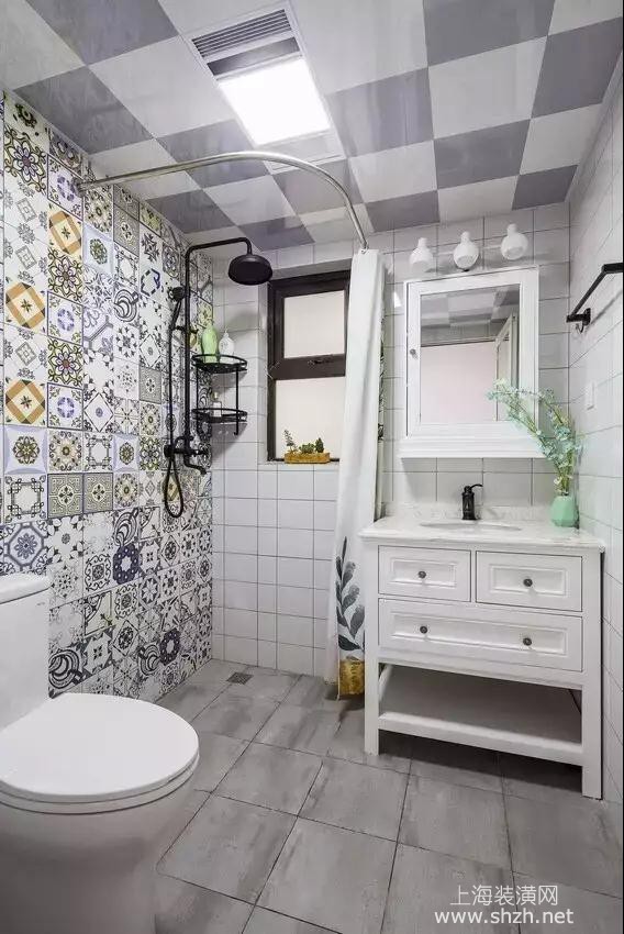 卫生间 - 卫生间通过浴帘来隔开洗浴空间,简洁的色彩穿插着整面墙的浮夸图案,个性十足,生活本该如此,简单平凡的日子也该有色彩斑斓的时候