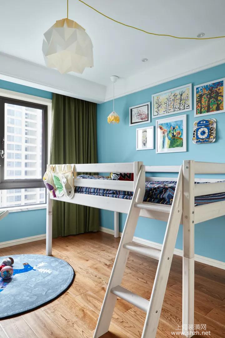 儿童房 - 儿童床采用一张层高较高的床铺,让床底腾空成为孩子的玩耍空间;让面积不大的卧室也能成为孩子的娱乐天地,这盏折纸造型的吊灯,搭配蓝白色调的空间,也让这个儿童房显得格外的童趣;