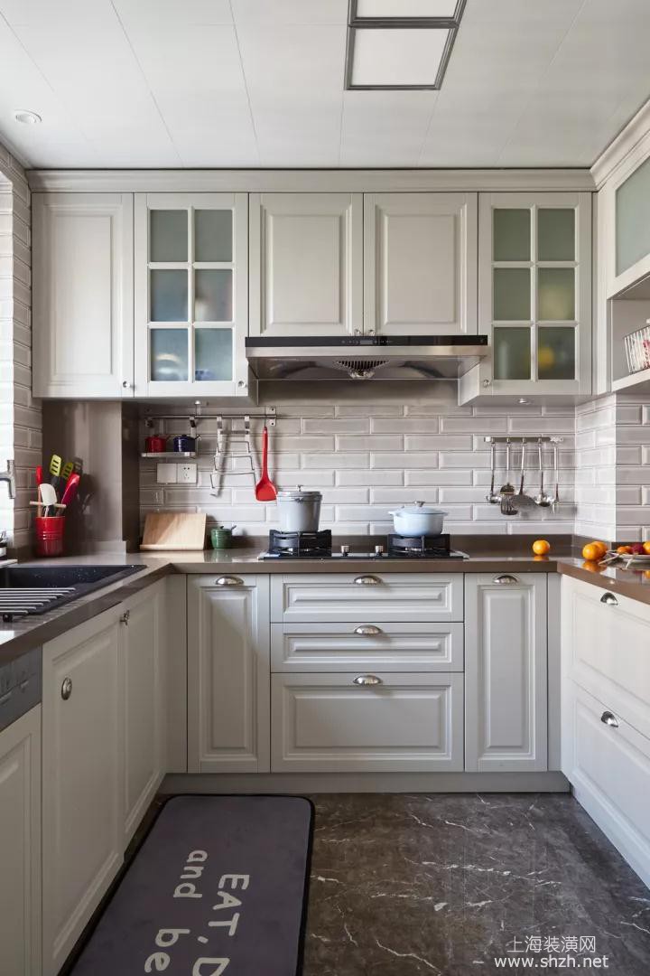 厨房 - 厨房以灰色地砖+仿古小墙砖,结合白色橱柜面板,显得优雅而又高档;