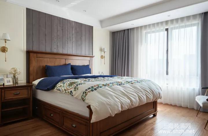 卧室 - 主卧的床头背景墙以灰色的木板装饰,结合原木质感的床与地板,整个主卧都给人以稳重与实用的氛围感;