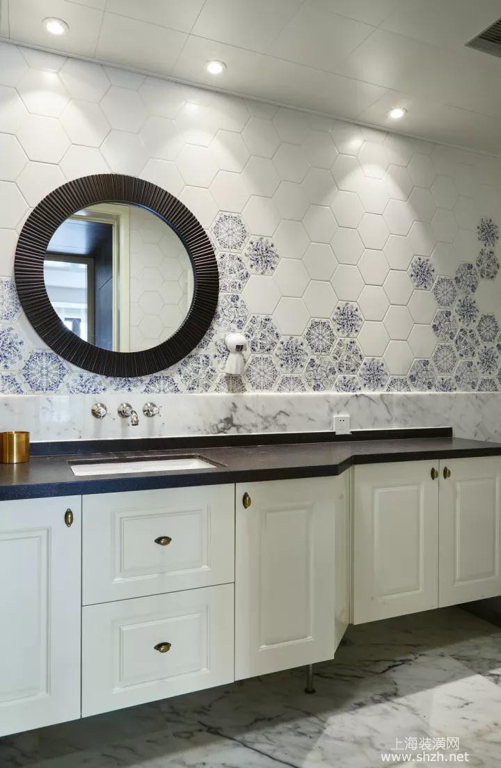 卫生间 - 卫生间墙面的六边形砖,在青花瓷色彩与独特图案的搭配,在精致的设计衬托下,打造出一个时尚与韵味兼具的空间.