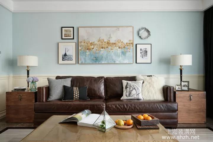 客厅 - 沙发墙墙角装上护墙板,上方以淡蓝乳胶漆刷新,独特的"4+1"的装饰画搭配,打造出一个独特的视觉感;棕色皮沙发,集合两侧的复古小边几柜,显得稳重而又高档;
