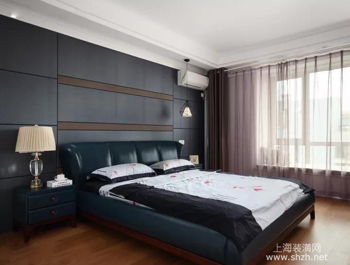 卧室 - 主卧床头在深蓝色硬包板的装饰,皮艺的床头靠垫,搭配优雅小资的的蓝色,整体显得低调奢华又端庄;