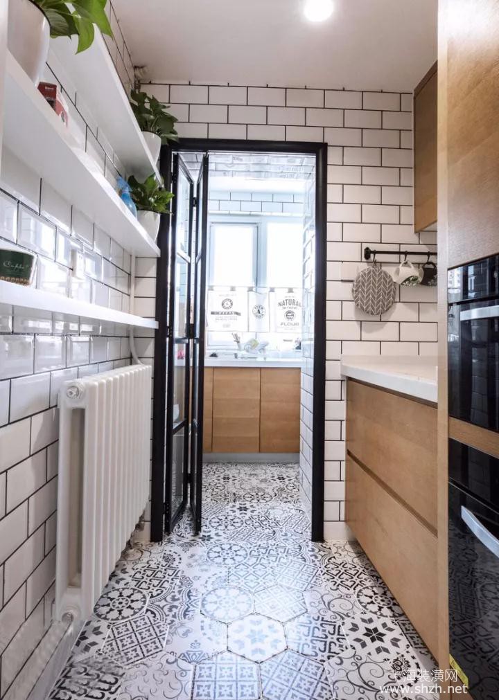 厨房 - 原本的阳台和厨房打通,加宽厨房的空间。利用黑框折叠门,将厨房的灶台独立在原本的阳台位置,即使是开放设计,室内也不会油烟到处飘。厨房上下都大量安装了木柜,以便收纳各种厨房用品。地面花色瓷砖搭配木色、白色,更显活泼气氛,给烹饪营造一个开心的情绪氛围。