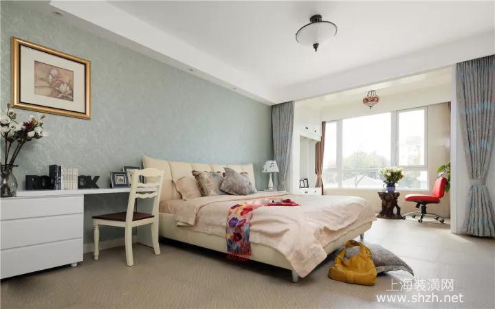 卧室 - 卧室在床头侧边设置了个小书桌,同时打通了阳台装成休闲区,整个卧室给人以满满的惬意气息;