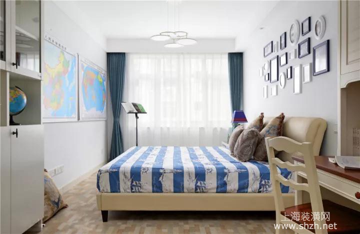 次卧 - 次卧在床位位置挂2幅地图,床头则挂着温馨的照片墙,杂色的地板结合蓝白条纹的床单,整个空间都充满了精致自然的气息;