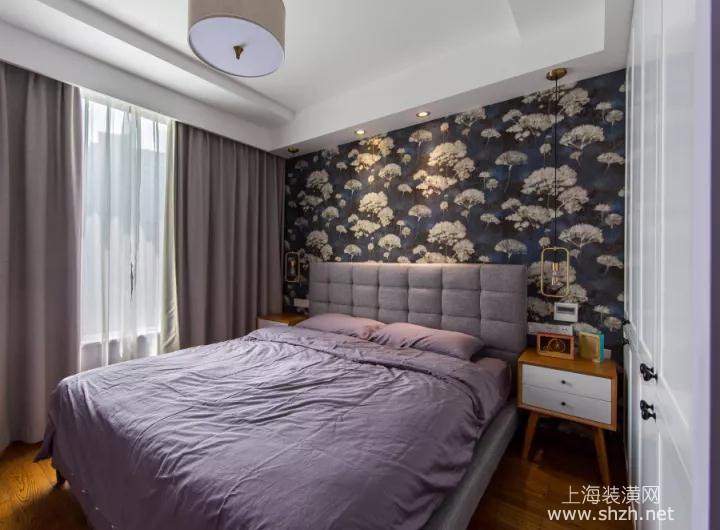 主卧 - 主卧床头贴着儒雅精致的壁纸,布置上一套简约灰色调的床单,给人一惬意轻松又稳重的氛围感;
