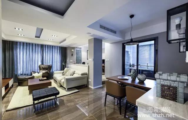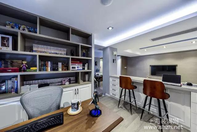 书房 - 沙发背景墙做成矮墙隔断,同时也是吧台,摆上两张吧椅之后,既可以在这里喝酒聊天,也可以在这里进行简单的小办公等,所以可同时满足多种需求。