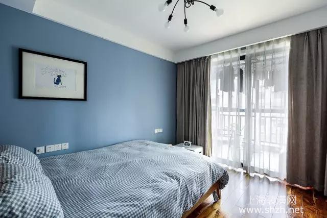 次卧 - 次卧墙面刷成蓝色,沉稳大气又耐看,床靠墙摆放,简约了面积,所以才有了更多的空闲区域来满足活动。