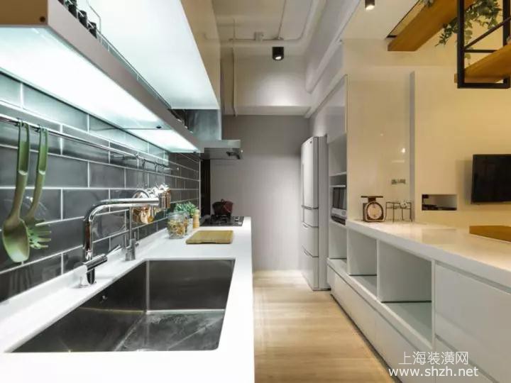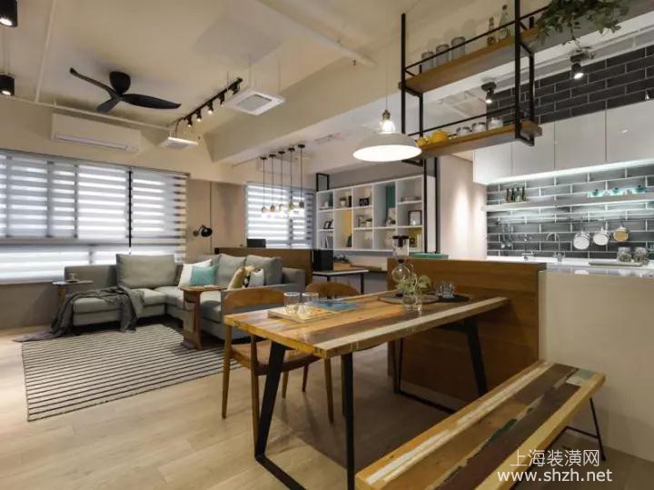 餐厅 - 餐厅一眼望去,厨房採用进口壁砖,既不抢走书房的视觉,但有各自主角呈现。餐桌和中岛上方规划业主喜爱的吊架,可以放喜爱的的收藏瓶子。