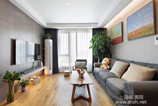 客厅 - 客厅是年轻简约的现代风格,在原木地板、小木茶几、浅灰木质的电视墙,搭配灰色的布艺沙发,整个空间都显得简洁大方又年轻时尚。