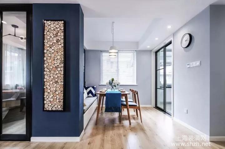 餐厅 - 深蓝色与灰色成为餐厅的主要色彩搭配,正对着我们的墙面采用无数根的木桩截面组成一幅挂画,真是“低调”的很有个性;