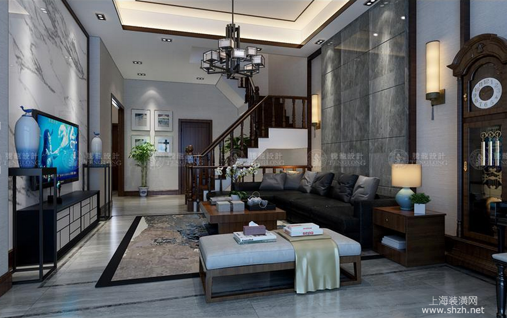 客厅 - 别墅装修新中式风格设计,上海腾龙别墅设计师周峻作品