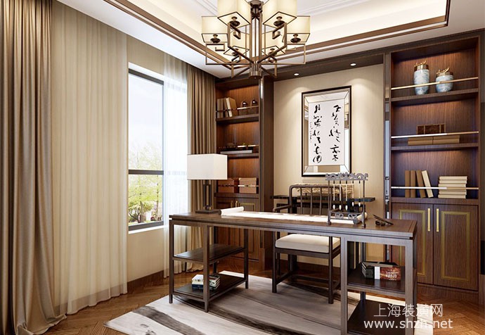 书房 - 康桥半岛300平别墅装修新中式风格设计,上海腾龙别墅设计作品