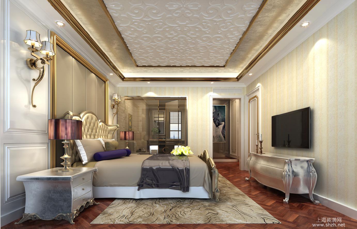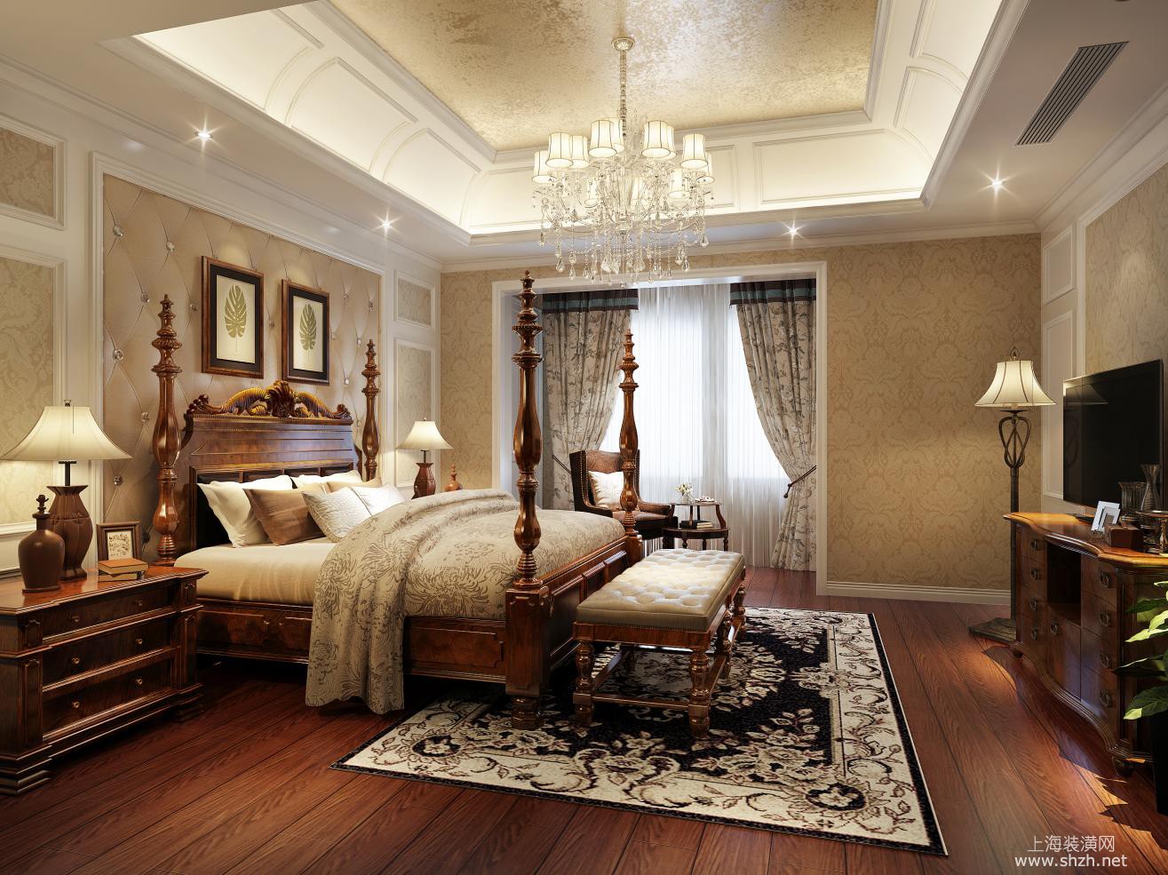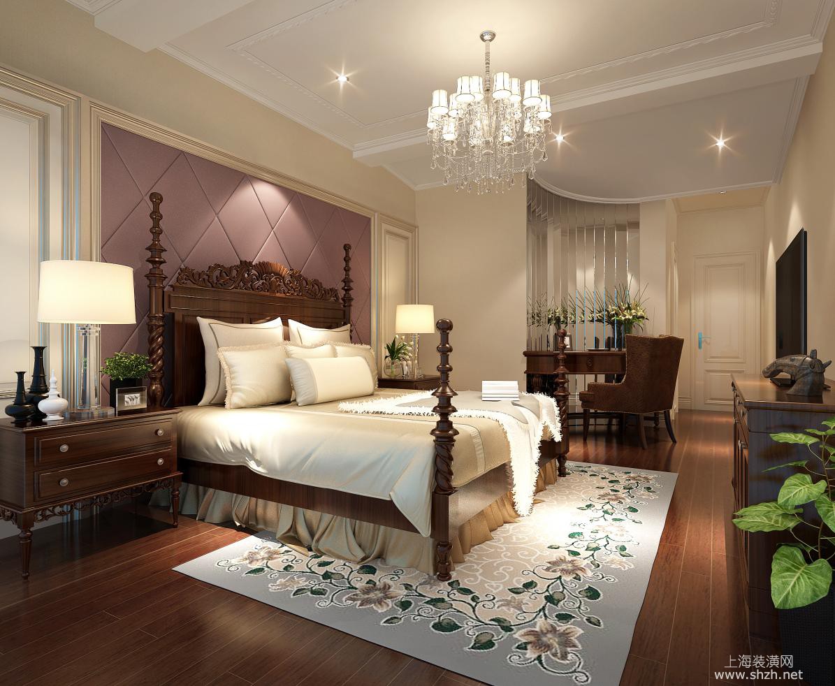 卧室 - 楼盘:新南路壹号 户型:280㎡联排别墅 设计风格:新古典 设计师:袁迪燕 案例介绍:本案采用新古典设计风格,客厅公共区域在温馨雅致的米白色基调下,采用大量的砖面打造墙地面,与同样色调的新古典家具及灯饰形成呼应,给人以视觉上的舒适感。在卧室以及书房内设计师同样选用新古典风格呈现,整体空间风格统一。
