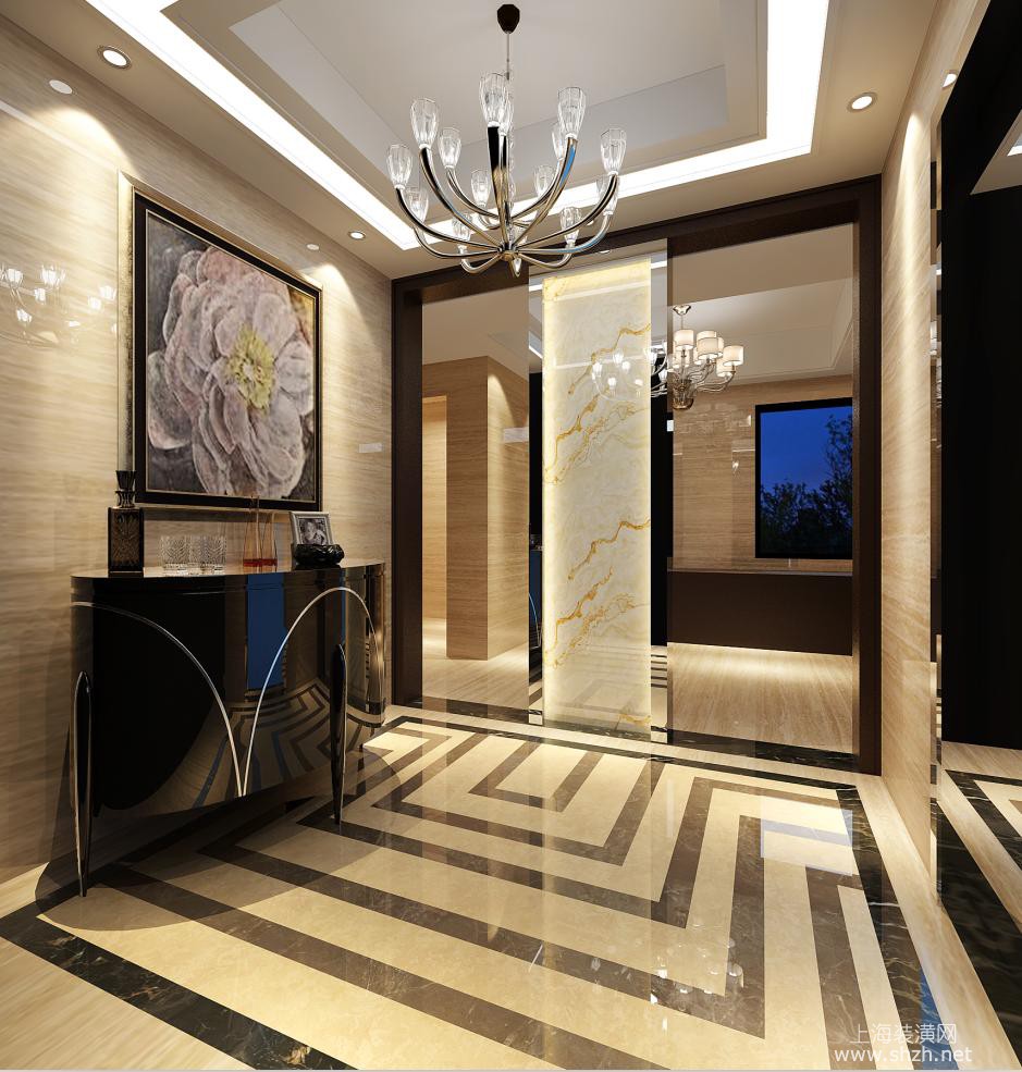 走廊 - 楼盘:新南路壹号 户型:280㎡联排别墅 设计风格:新古典 设计师:袁迪燕 案例介绍:本案采用新古典设计风格,客厅公共区域在温馨雅致的米白色基调下,采用大量的砖面打造墙地面,与同样色调的新古典家具及灯饰形成呼应,给人以视觉上的舒适感。在卧室以及书房内设计师同样选用新古典风格呈现,整体空间风格统一。
