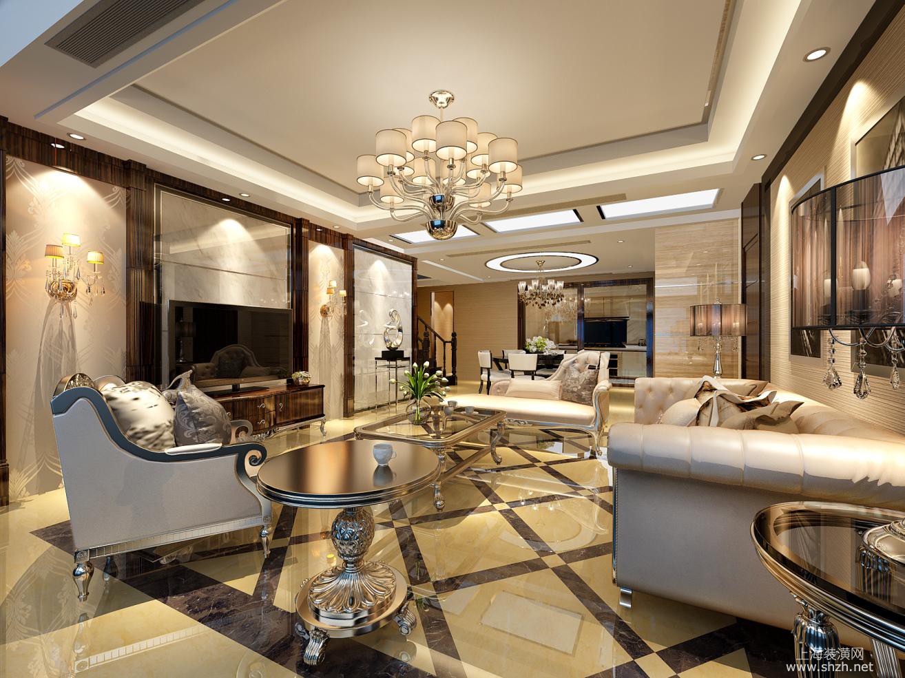客厅 - 楼盘:新南路壹号 户型:280㎡联排别墅 设计风格:新古典 设计师:袁迪燕 案例介绍:本案采用新古典设计风格,客厅公共区域在温馨雅致的米白色基调下,采用大量的砖面打造墙地面,与同样色调的新古典家具及灯饰形成呼应,给人以视觉上的舒适感。在卧室以及书房内设计师同样选用新古典风格呈现,整体空间风格统一。