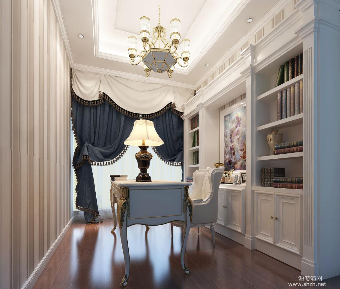 书房 - 楼盘:新南路壹号 户型:280㎡联排别墅 设计风格:新古典 设计师:袁迪燕 案例介绍:本案采用新古典设计风格,客厅公共区域在温馨雅致的米白色基调下,采用大量的砖面打造墙地面,与同样色调的新古典家具及灯饰形成呼应,给人以视觉上的舒适感。在卧室以及书房内设计师同样选用新古典风格呈现,整体空间风格统一。
