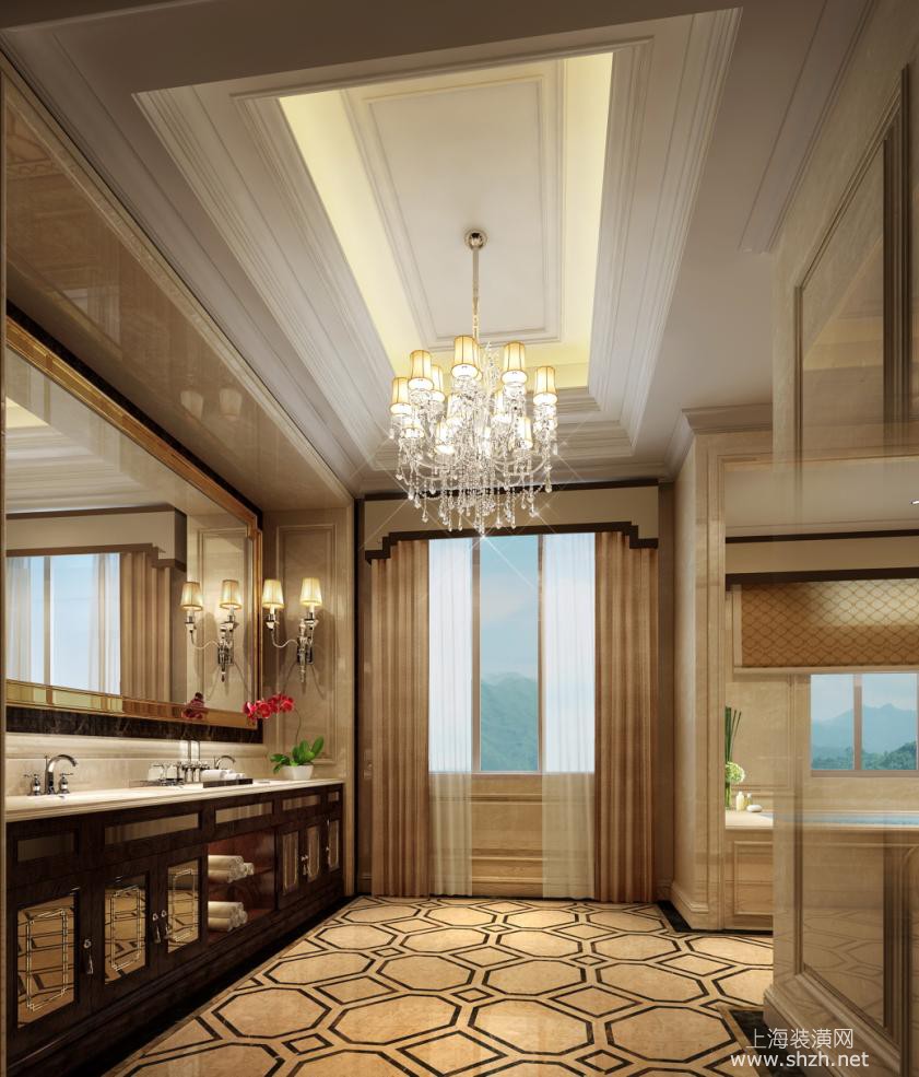 卫生间 - 楼盘:绿洲比华利 户型:780㎡独栋别墅 设计风格:新古典 设计师:章伟 案例介绍:本案充分体现了新古典主义风格,热衷于收藏艺术品和古董的业主对于新居的风格需求十分明确。象牙白香槟金大理石装饰,蓝色与卡其色通过用亮白色与罗曼棕的搭配彰显经典,设计师将现代生活与艺术完美结合,缔造出此套气派十足的优雅大宅。
