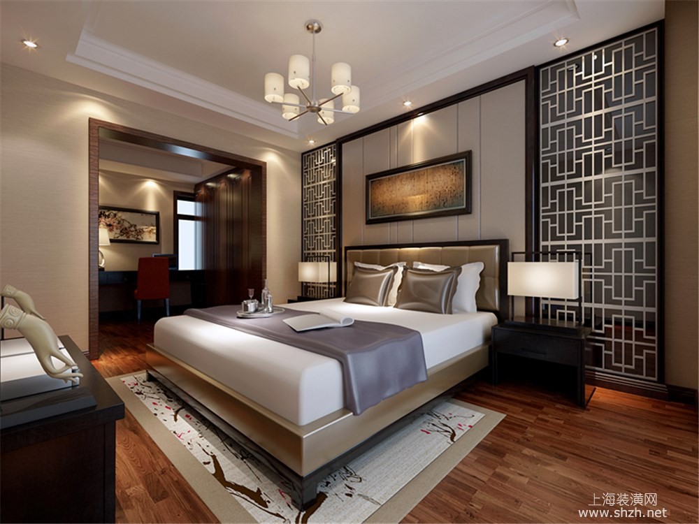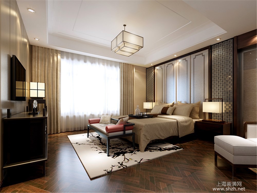 卧室 - 绿地海域观园别墅装修新中式风格设计,上海腾龙别墅设计作品,欢迎品鉴