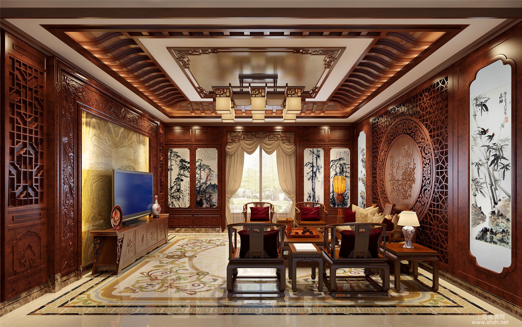 6中式会客厅.jpg - 绿城玫瑰园别墅项目装修欧式古典你风格更设计方案展示,上海腾龙别墅设计师郭建作品,欢迎品鉴