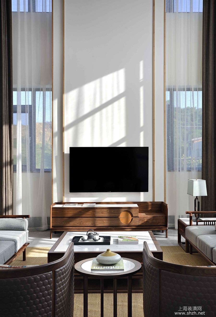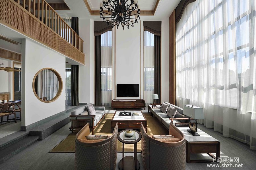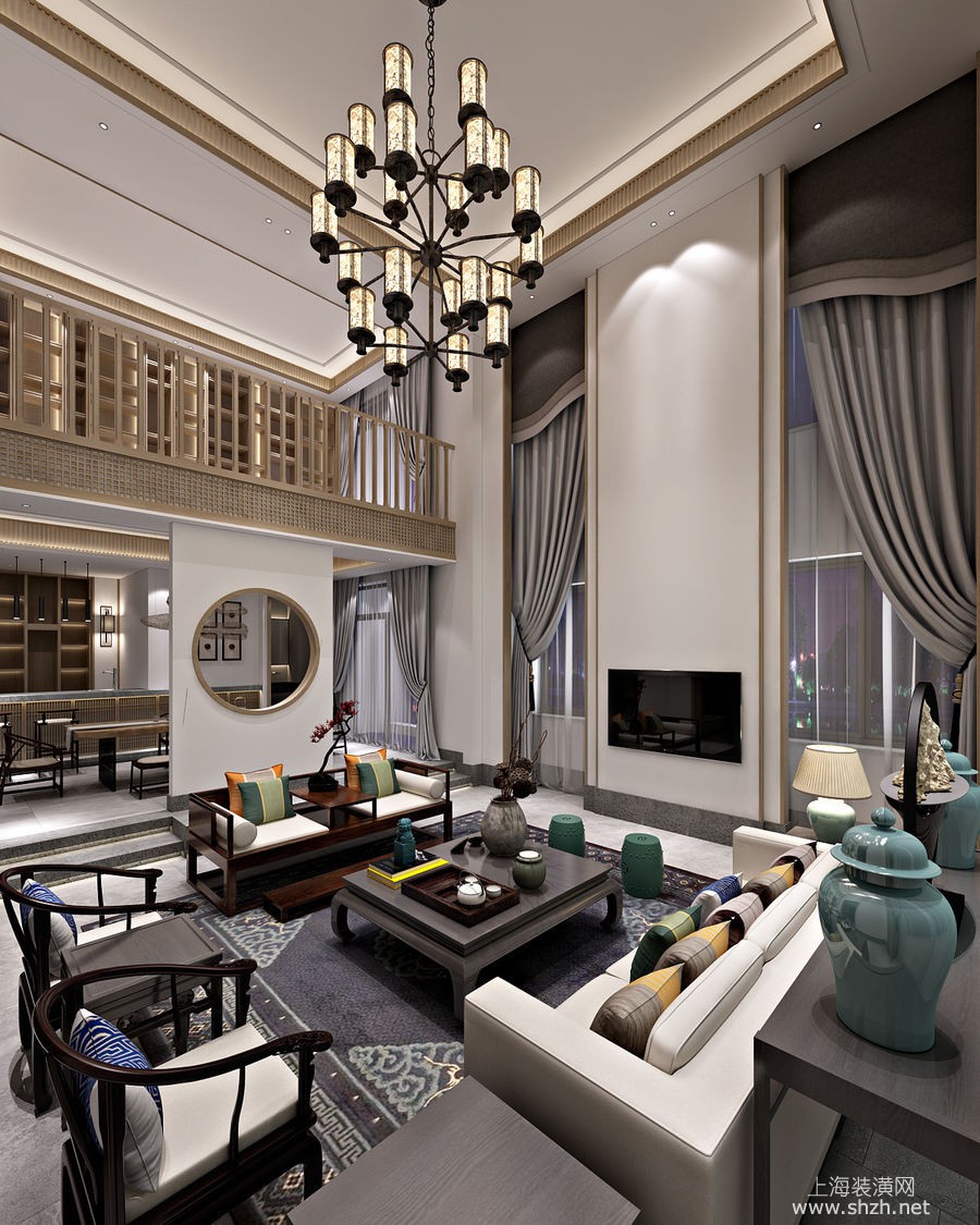 客厅 - 别墅装修新中式风格设计案例展示,上海腾龙别墅设计作品,欢迎品鉴